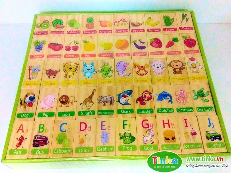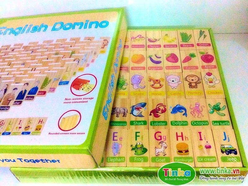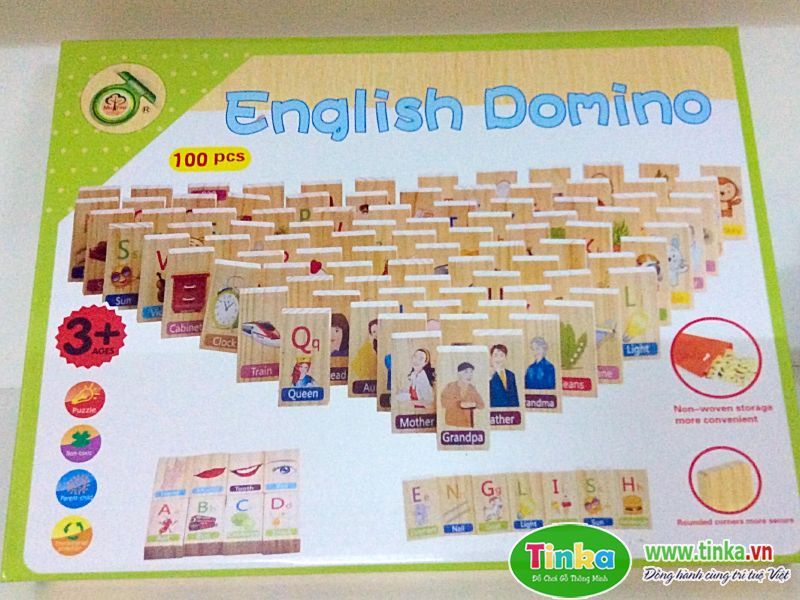 Domino Tiếng Anh là một sản phẩm đồ chơi gỗ thông minh tốt cho bé trên 2 tuổi. Trò chơi gồm 100 mảnh hình có chữ Tiếng Anh kèm theo bao quát tất cả các chủ đề xung quanh bé như con vật, gia đình, phương tiện giao thông…