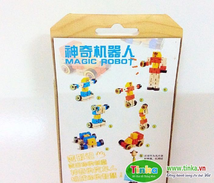 – Từ hình dạng ban đầu là robot bé sẽ nhìn theo các hình mẫu trên bao bì để có thể tạo ra nhiều hình khác nhau như xe, máy bay…Sau khi quen , bé có thể tự nghĩ ra các hình theo ý thích và xoay, di chuyển các khớp gỗ để tạo hình.